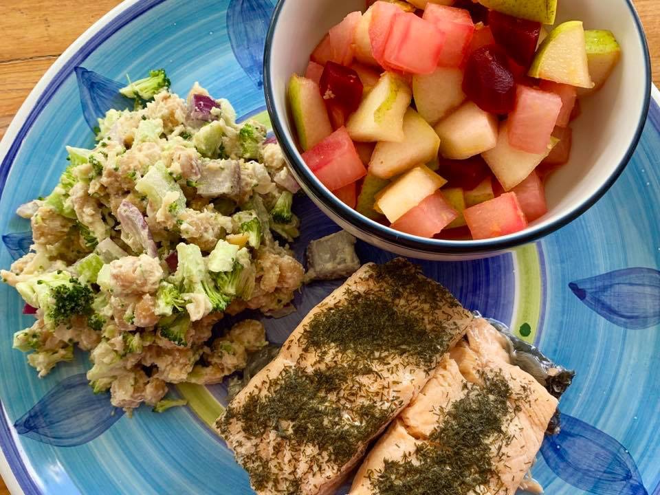 味付けは塩。ビーツの方はヒカマと洋梨をオレンジを絞ったジュースと生姜で和えたもの。塩少々。サーモンはプレッシャークッカーでシュシュっとスチーム。